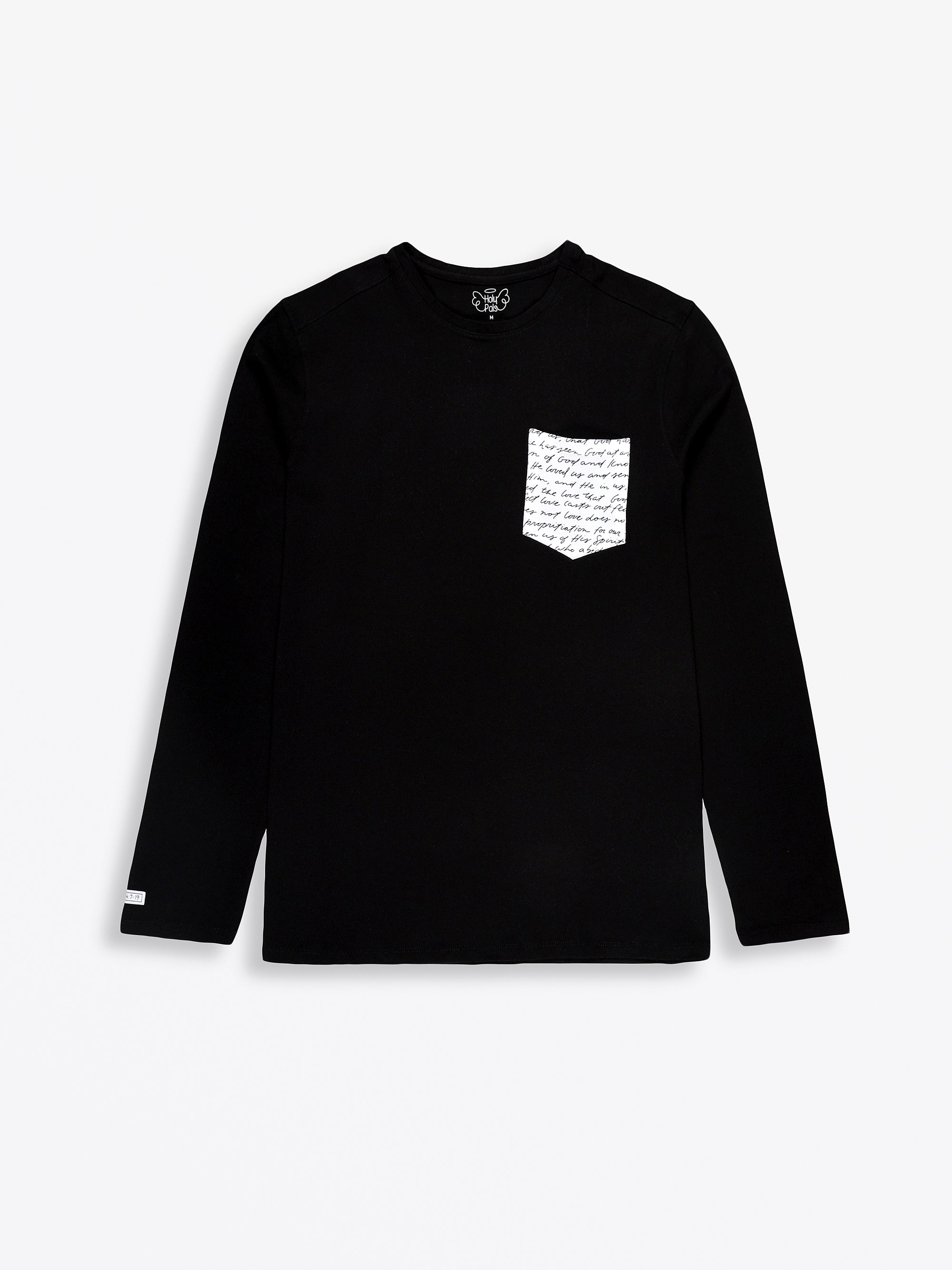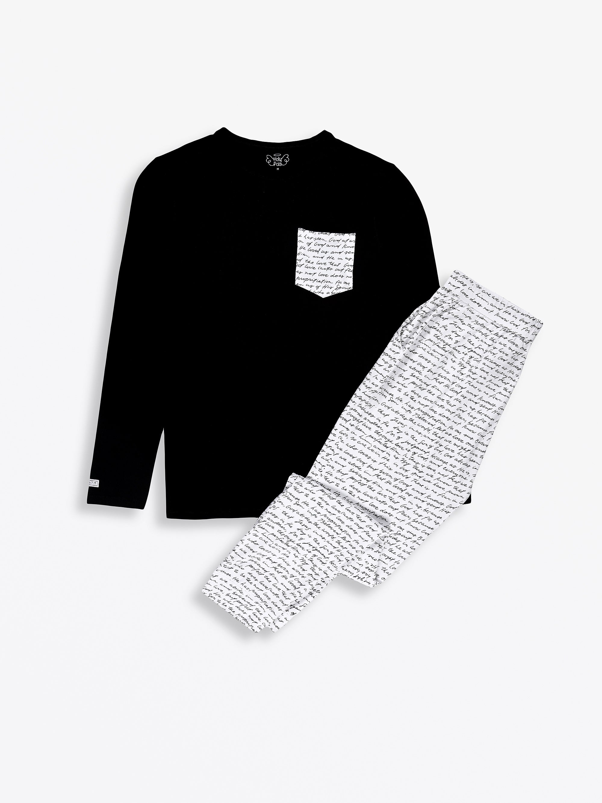 This Men's Long Sleeve Pajama Set includes a crew neck top and relaxed-fit pants, both made from our high-quality, 100% Premium Cotton knit fabric. It features our exclusive "Love One Another" print, which displays the full, custom-written text of the fundamental passage 1 John 4:7–19 in an elegant script. The pants feature an adjustable elastic waistband and functional pockets. The set includes the unique Scripture label detail on the sleeve cuff. Available in sizes XS–XXL.