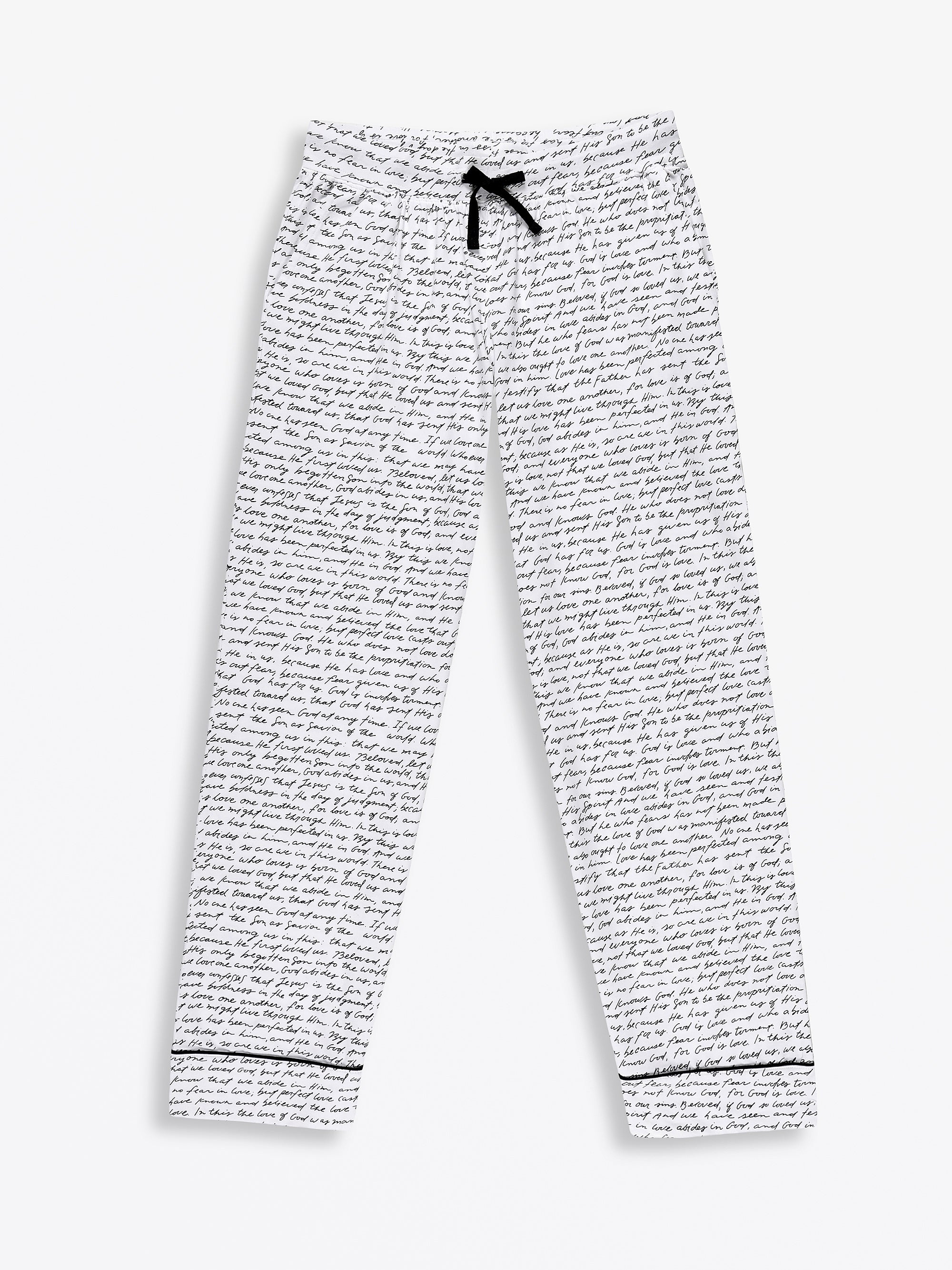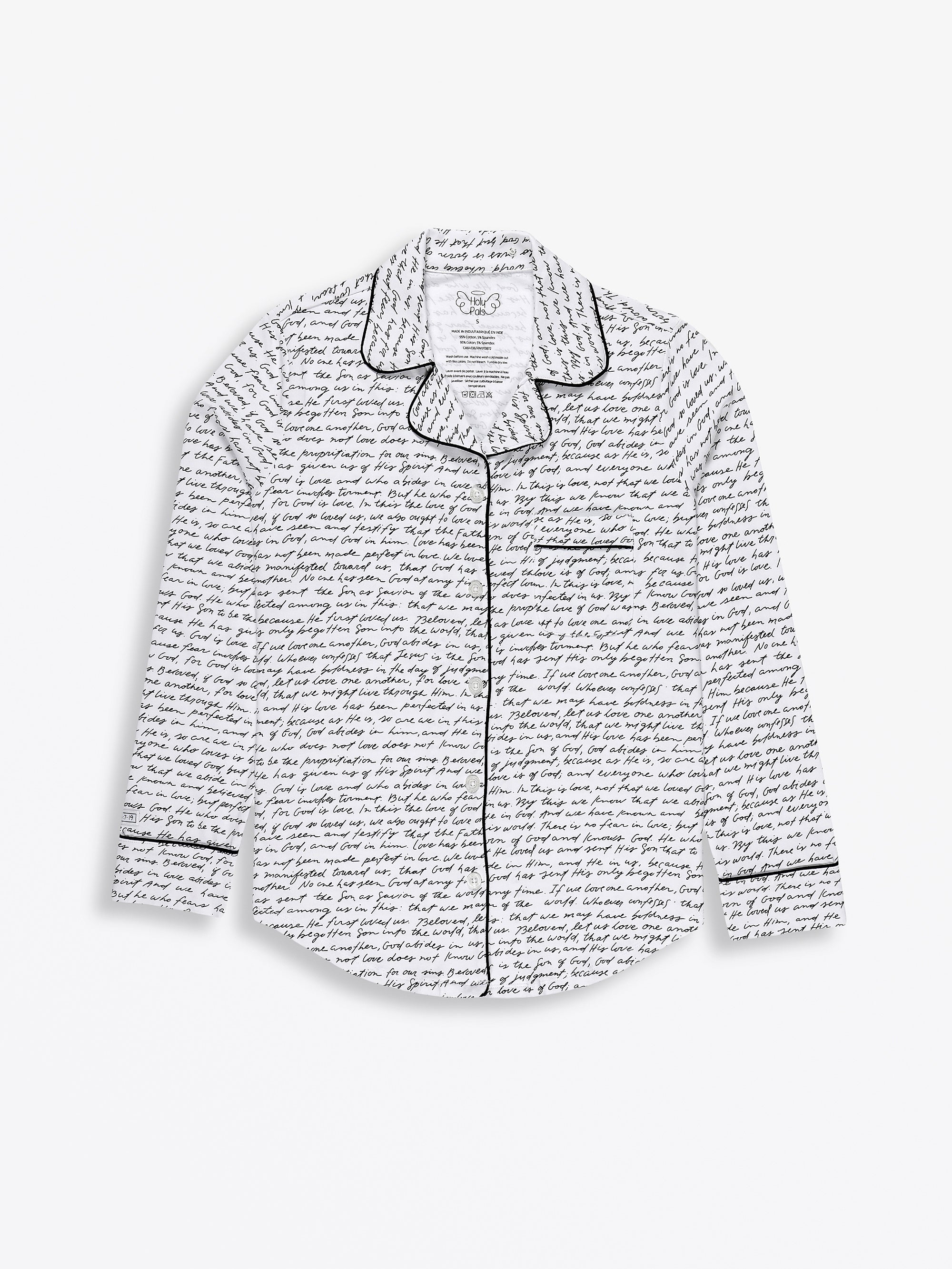 This Women's Notch Collar Pajama Set includes a long-sleeve, button-up top and relaxed-fit pants, both made from our high-quality, 100% Premium Cotton fabric. It features our exclusive "Love One Another" print, which displays the full, custom-written text of the fundamental passage 1 John 4:7–19 in an elegant script. The top features a notched collar and the set includes the unique Scripture label detail on the sleeve cuff. Available in sizes XS–XXL.