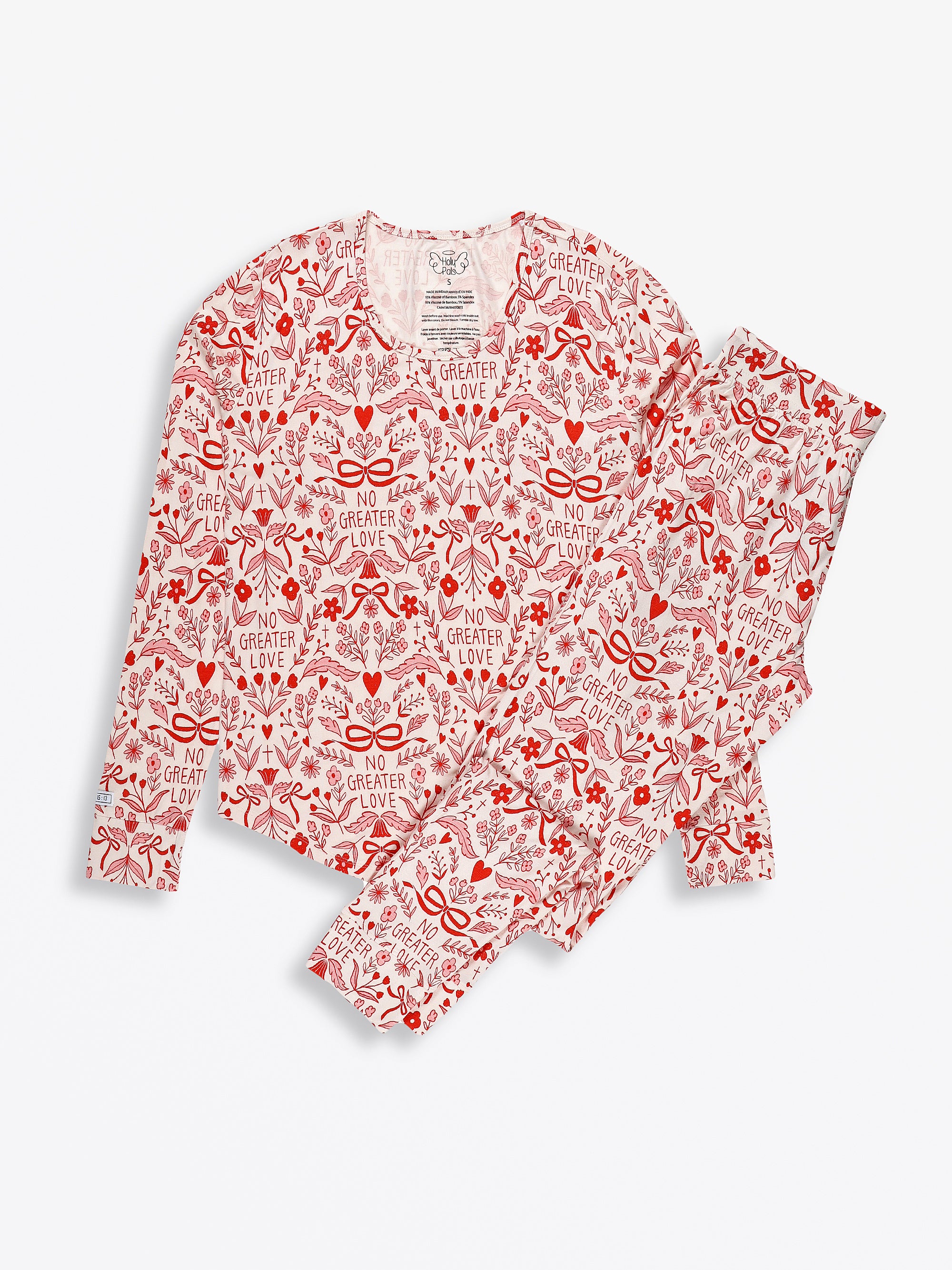 This Women's Long Sleeve Jogger Set includes a crew neck top and elastic-waist pants, both made from our high-quality Bamboo fabric. It features our exclusive "No Greater Love" pink ribbon and floral print, rooted in the message of John 15:13. The set includes the unique Scripture label detail on the sleeve cuff and is available in sizes XS–XXL.