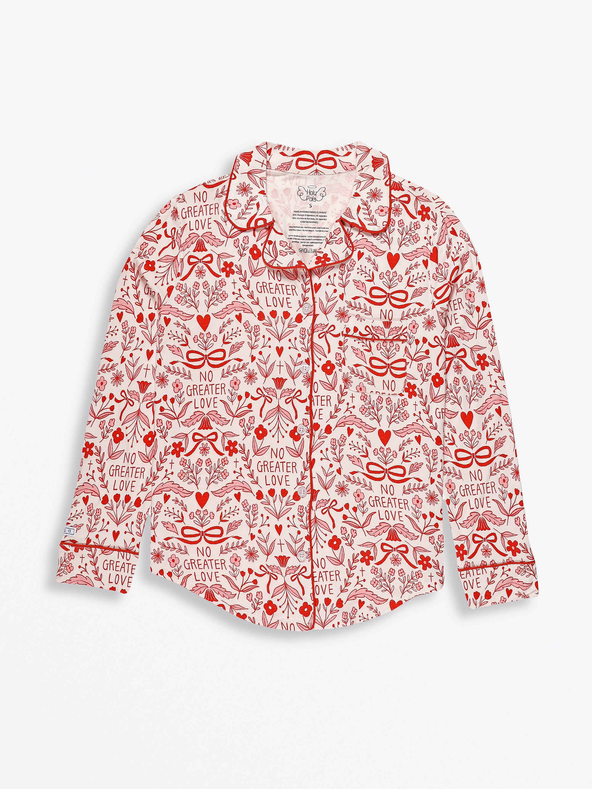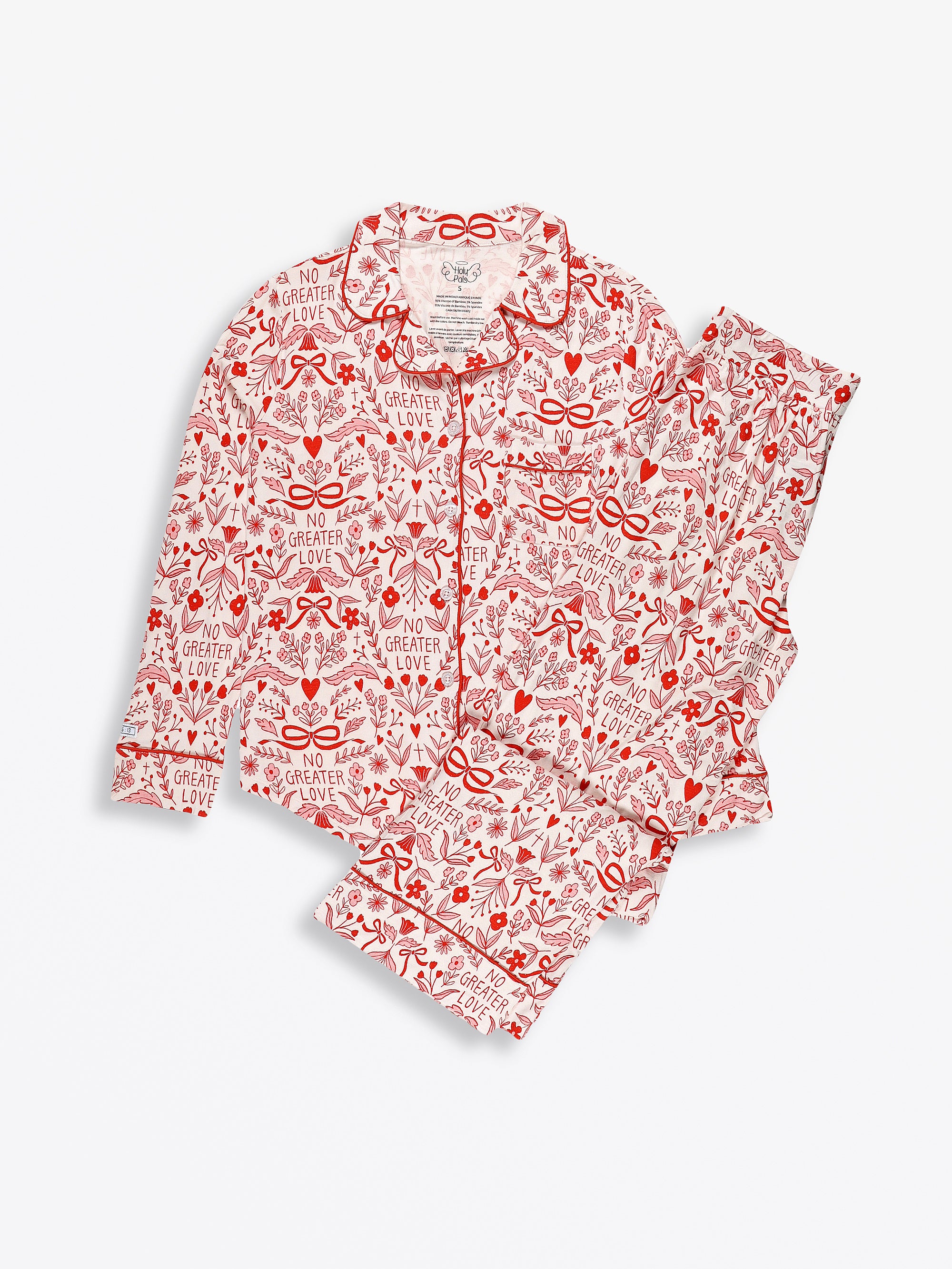 This Women's Notch Collar Pajama Set includes a long-sleeve, button-up top and relaxed-fit pants, both made from our high-quality Bamboo fabric. It features our exclusive "No Greater Love" pink ribbon and floral print, rooted in the message of John 15:13. The set includes the unique Scripture label detail on the sleeve cuff and is available in sizes XS–XXL.