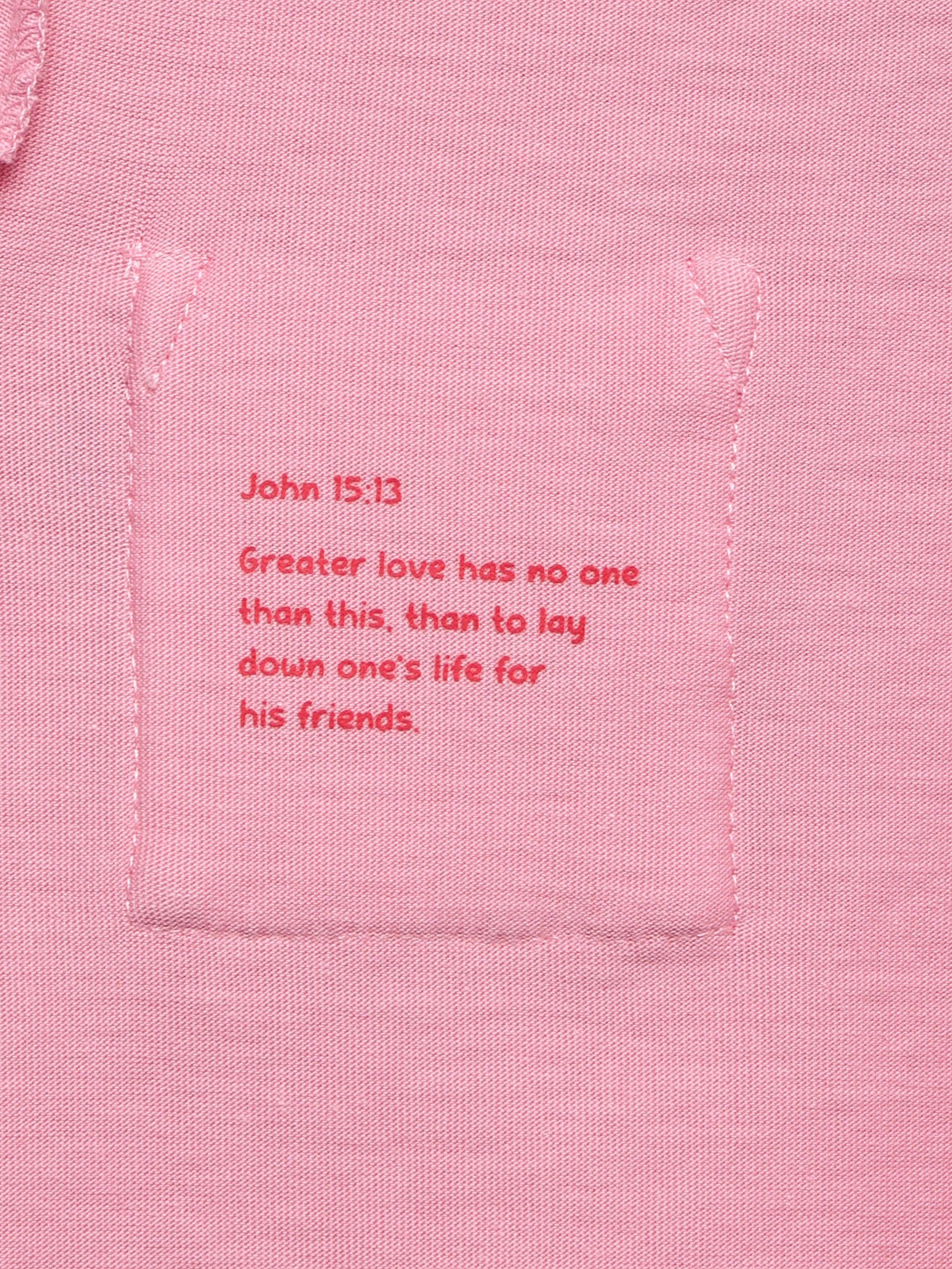 But that’s not all—on the inside of the shirt, printed right over the heart, is a powerful verse to anchor them in truth: John 15:13 Greater love has no one than this, than to lay down one’s life for his friends. It’s our way of putting Scripture on their heart, just like God instructs us in Deuteronomy 6:6, helping kids build an independent prayer life that goes beyond bedtime.