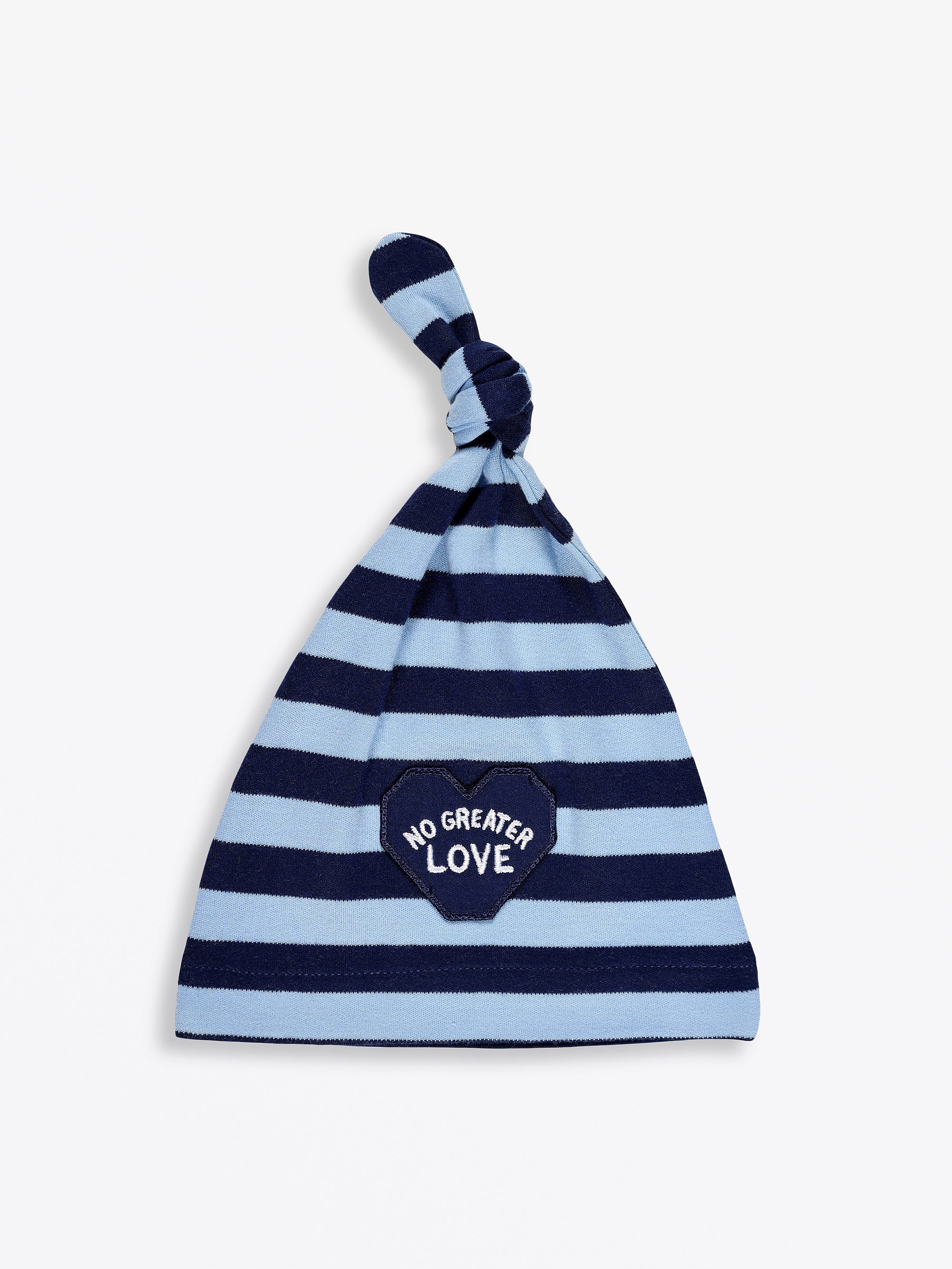 This Knotted Hat is crafted from the same high-quality, cozy, 100% Premium Cotton as our popular sleepwear collection, ensuring maximum softness and breathability. It features the exclusive "No Greater Love" blue stripe design and is designed to be soft, breathable, and easy to wash. The soft fabric provides a gentle stretch for a comfortable fit on heads from 0 to 12 months.