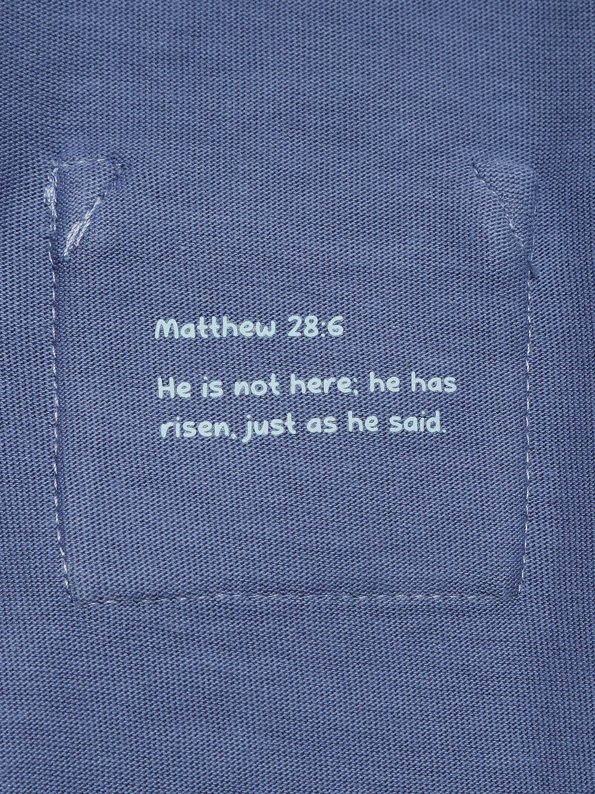But that’s not all—on the inside of the shirt, printed right over the heart, is a powerful verse to celebrate the true meaning of Easter: Matthew 28:6 He is not here; he has risen, just as he said. It’s our way of putting Scripture on their heart, just like God instructs us in Deuteronomy 6:6, helping kids build an independent prayer life that goes beyond bedtime.