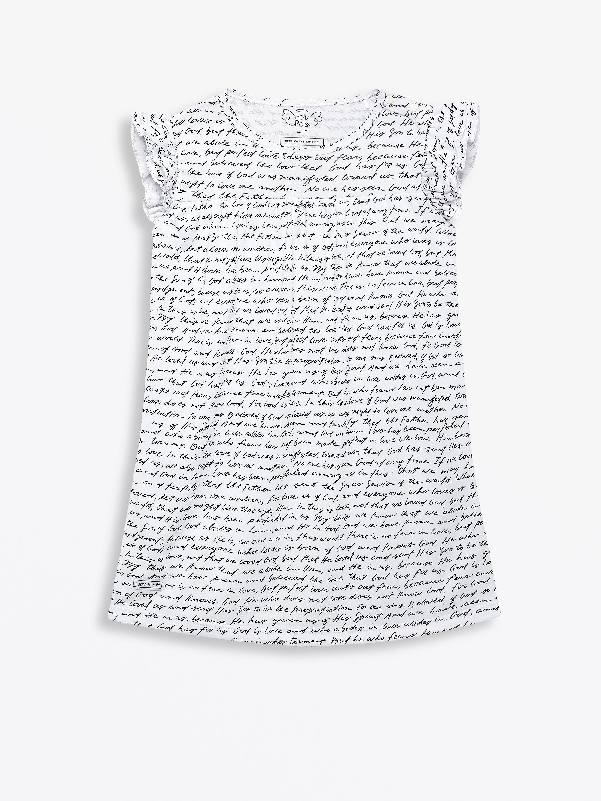This Girls Nightgown features our exclusive "Love One Another" print, with the full text of 1 John 4:7–19 written in elegant script. The design features short sleeves, a comfortable crew neck, and a flowing skirt for ease of movement. The gown includes the unique Scripture label detail on the cuff and is available in children's sizes 2–10.