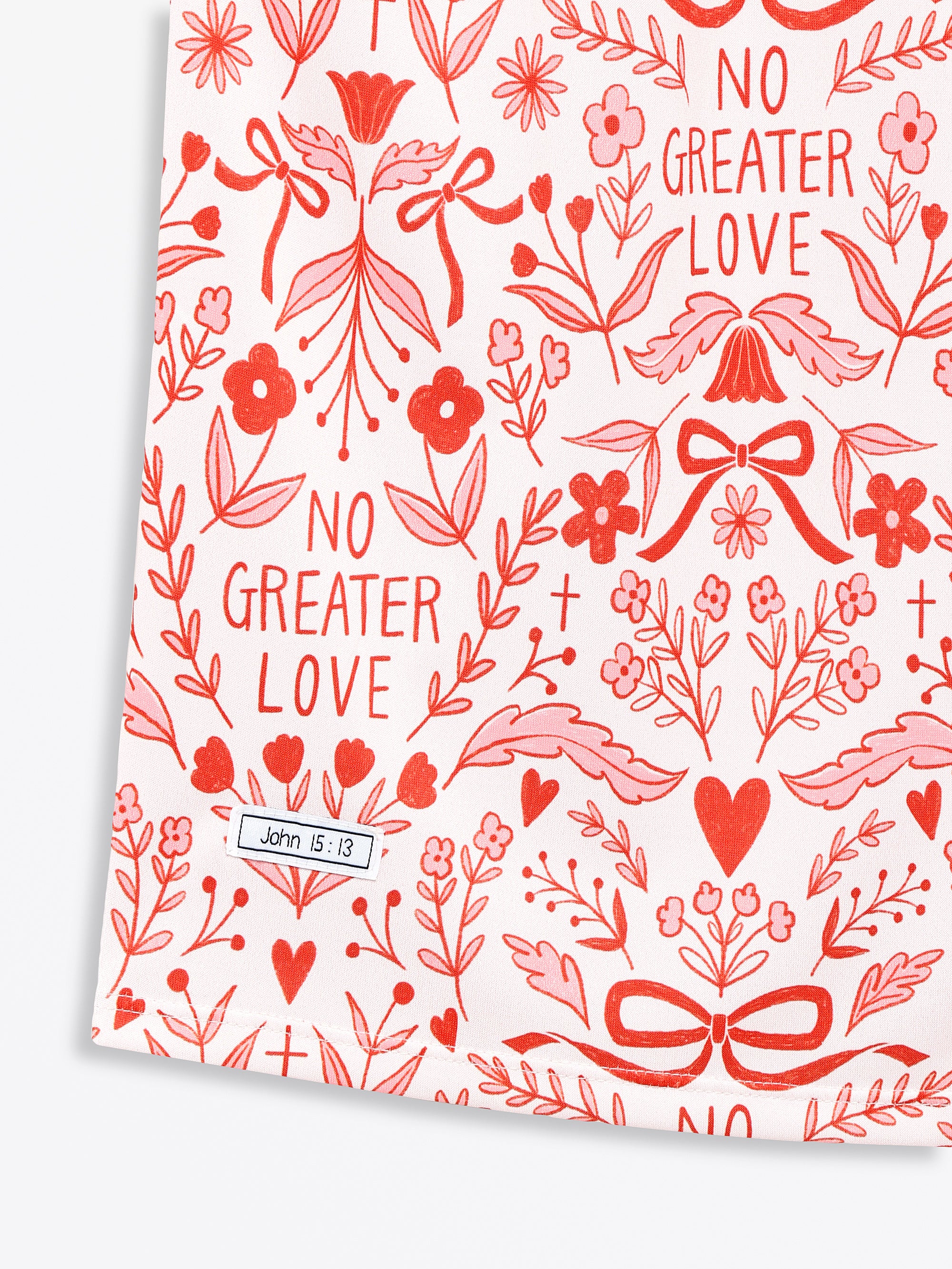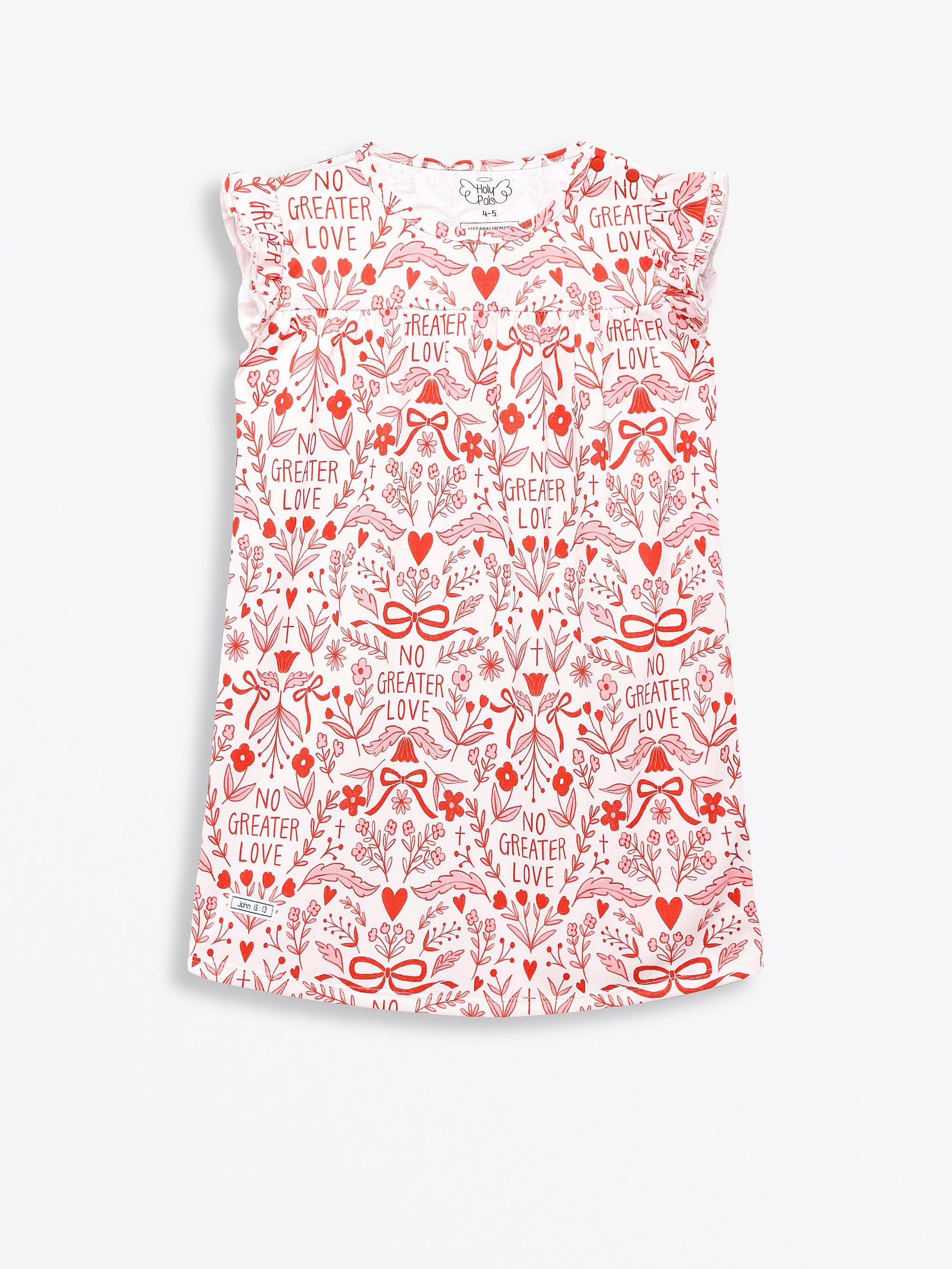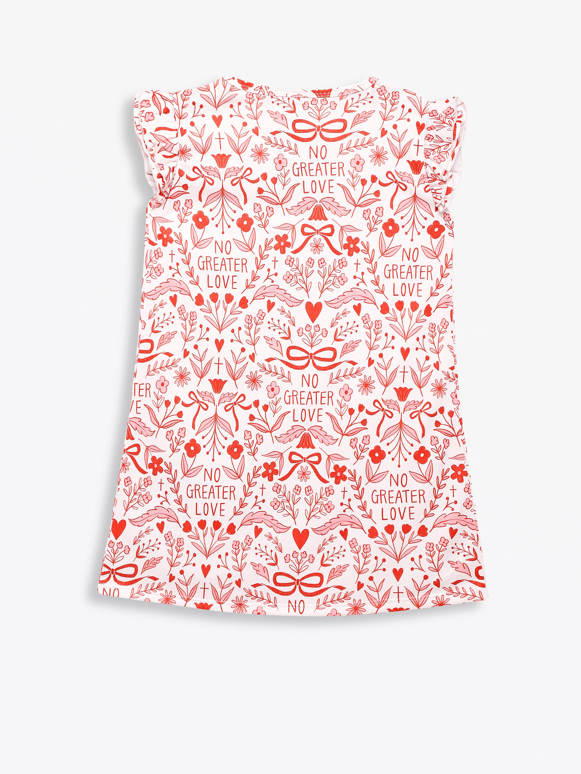 This Girls Nightgown features our exclusive "No Greater Love" pink ribbon and floral print, rooted in the message of John 15:13. The gown includes short sleeves with the unique Scripture label detail on the cuff and is available in sizes 2–10.