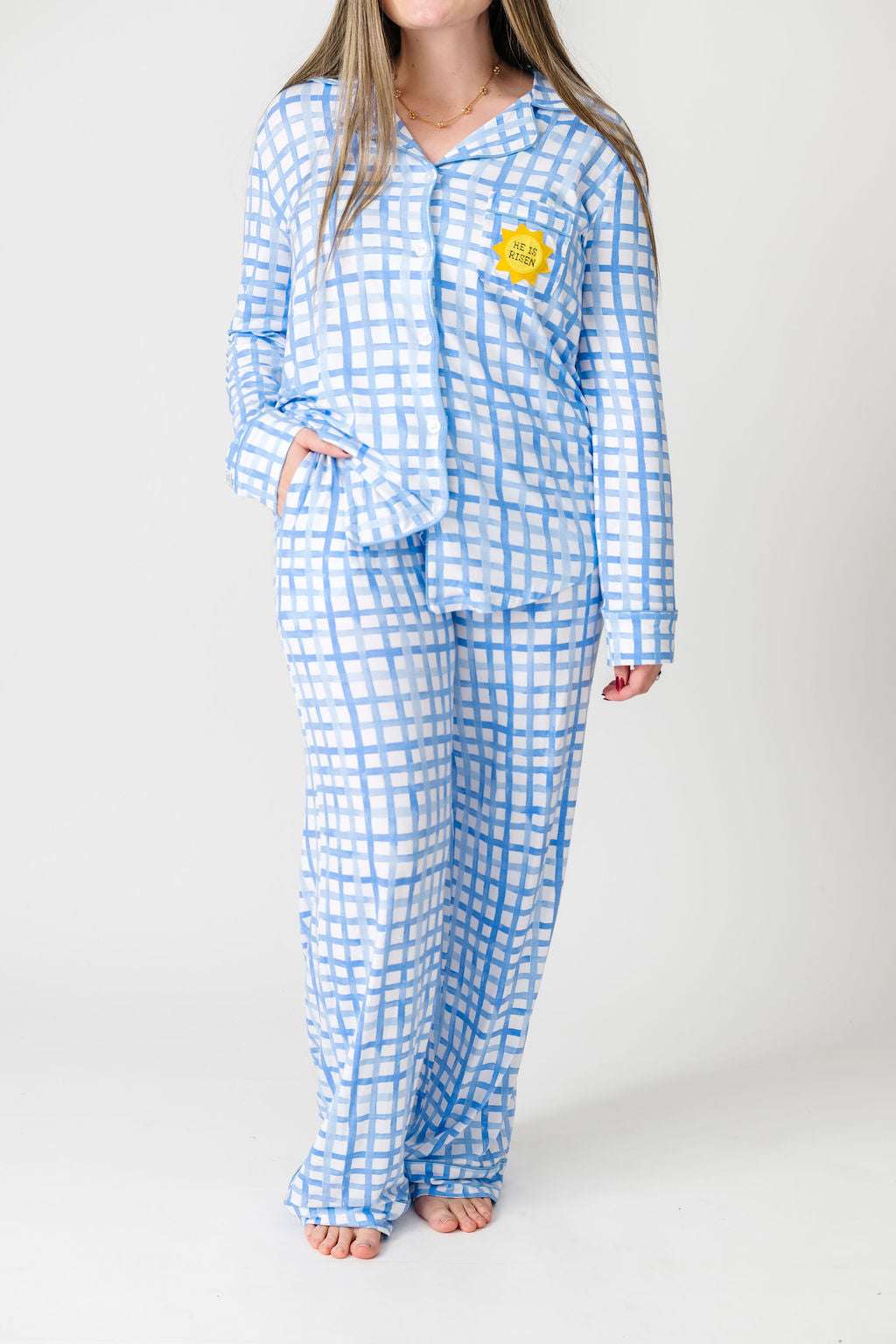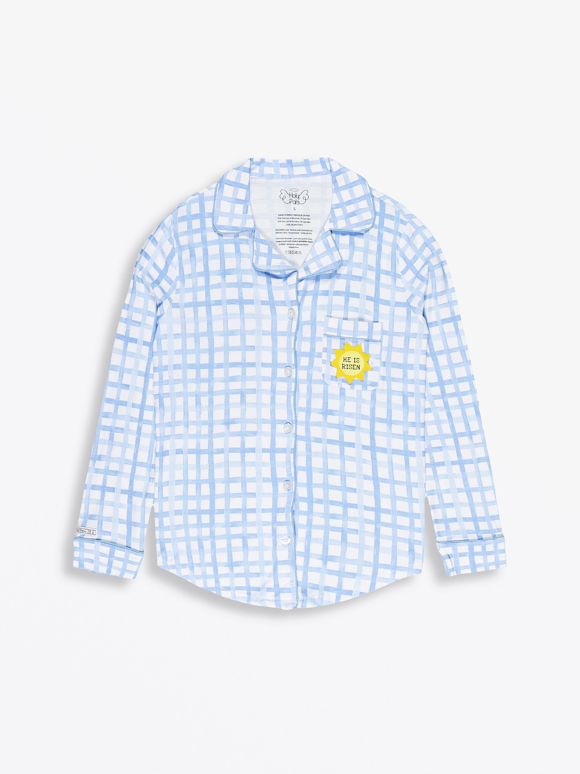 This Women's Notch Collar Pajama Set includes a long-sleeve, button-up top and relaxed-fit pants, both made from our high-quality Buttery Soft Bamboo. Our 'Risen Son' print is such a sweet way to talk about Easter morning! It pairs a classic blue gingham with a bright yellow sun to help you tell your kids the best news ever—that Jesus, the Son of God, is risen indeed.
