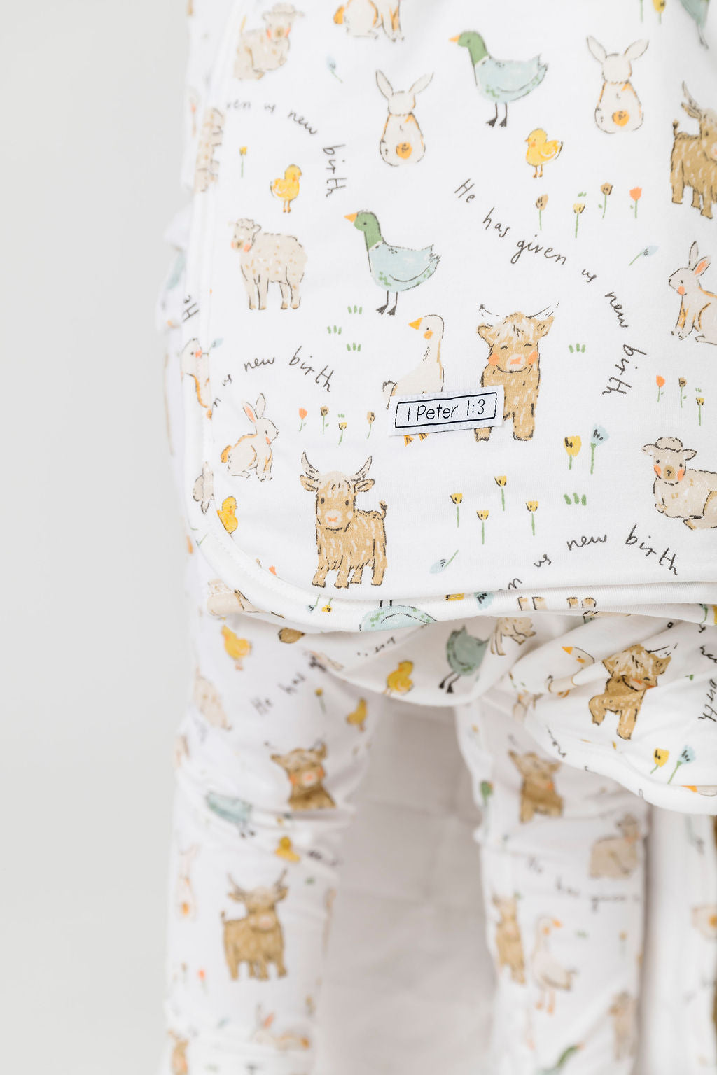 This blanket is made from our premium Bamboo fabric with a 100% Polyester fill. It features the "New Birth" print, based on 1 Peter 1:3, with a soft illustrative finish. The fabric is durable, machine washable, and designed to provide gentle warmth for infants and toddlers.